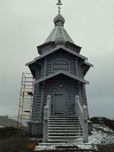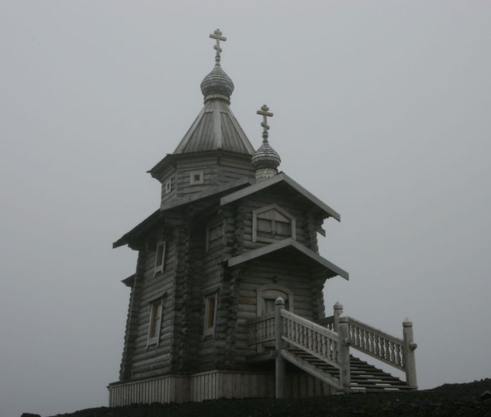 Cette année, cela fait 19 ans que les vieux croyants russes ont démonté une église en bois pour la remonter en Antarctique. L’église a été érigée près de la station russe Bellingshausen de l’Antarctique, sur l’île de Waterloo. Actuellement, l’église est la propriété du Patriarcat de Moscou.