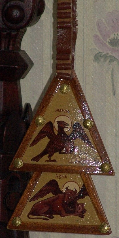 Les 33 prochaines petites étapes représentent les années de la vie terrestre du Sauveur et les 17 dernières sont les prophètes de l’Ancien Testament qui ont parlé du Christ. Le vide situé après les lapotski représente le ciel.Strictement préservé au quatrième siècle par saint Basile le Grand, le nombre total de marches – cent petites, intercalées par trois grandes. Six grandes marches séparées, situées sur le bord supérieur des lapostki, ainsi que trois grandes marches de l’escalier symbolisent neuf rangs d’anges. Ils rappellent les anges gardiens qui soutiennent constamment les gens dans une montée longue et pénible de l’échelle spirituelle et mettent en garde contre toute chute.La boucle sans fin des marches rappelle la prière incessante. Les quatre triangles (en l’honneur de la Sainte Trinité), des lapostki symbolisent les quatre évangélistes, la bordure entourant le lapostok – l’enseignement de l’Évangile. À l’intérieur, dans les lapostki du haut, sept petites marques ou perles sont cousues en fonction du nombre des sept sacrements de l’église (à suivre)